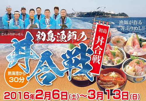 今年もこの季節がやってきました! 「初島漁師の丼合戦」(どんぶりがっせん)が2月6日(土)より開催されます! 島の漁師が営む16店舗からなる「食堂街」、ならびに「ピクニックガーデン」にて、獲れたての地魚やイカ、エビ、サザエ、アシタバ(伊豆名産野菜)といった地元食材をふんだんに使った丼ぶりを提供し、その人気を競い合う、島を挙げてのグルメイベントです。(丼合戦期間限定のオリジナル丼ぶりをご提供) 往復乗船券と丼合戦専用丼ぶりが食べられる「ミールクーポン」(食事券)が付いた、おトクなセット券も発売! 島内は桜など春の花をはじめ、ストレリチア、アロエなどの南国の花も咲いております。食事のあとは 島内を散策するのもいかかでしょうか? 皆様の「参戦」を心よりお待ちしております!! 【「初島漁師の丼合戦」の概要】 開催期間 平成28年2月6日(土)~3月13日 11:00~15:00(食堂街の営業時間内) 参加店舗 食堂16店舗、初島ピクニックガーデン(BBQレストラン)の合計17店舗 料 金 丼合戦セット券(往復乗船券+ミールクーポン) 大人3260円(定価3500円)、小人2180円(定価2300円) ※発売箇所:熱海港ならびに、伊東港乗船窓口 ※お好きな店舗で「丼合戦」オリジナル丼ぶりメニューが食べれるミールクーポン(1100円分)と熱海・伊東港~初島の 往復乗船券が付いたおトクなセット券です。セット券ご利用者に限り、お食事の際に、名物の「ところ天」をサービス (食堂街16店舗が対象) ※のんびり過ごせる、南国風の庭園「アジアンガーデン」の入園料が含まれたセットの券もございます。 (大人3900円、小人2500円) ※ミールクーポン無しで現地でご注文される場合、差額が発生する場合がございます。上記のセット券のご利用をお願いします。 【フォトスポット新設】 島内5ヶ所に、来島記念のフォトスポットを設置いたします。記念撮影にお役立て下さい。 (設置箇所) ①初島港 ②初木神社 ③初島公園前 ④アジアンガーデン ⑤トレーラーヴィラ ※④⑤は入園料が必要となります。 (主催) 初島区事業協同組合 (後援) 熱海市、一般社団法人熱海市観光協会、熱海温泉ホテル旅館協同組合 (協力) 株式会社富士急マリンリゾート