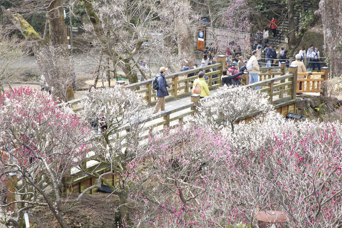1886年(明治19年)に開園した熱海梅園は、 日本一早咲きの梅で有名です。毎年11月下旬~12月上旬には、第一号の梅の花が開花します。 樹齢100年を越える梅の古木を含め、59品種・472本の梅が咲き誇り、早咲き→中咲き→遅咲きと、順番に開花。梅まつり期間中、梅を存分にお楽しみいただけます。 期間中、園内には足湯や土産店もオープン。 日によって熱海芸妓連演芸会や琴演奏会、甘酒無料サービスなどのイベントも実施します。