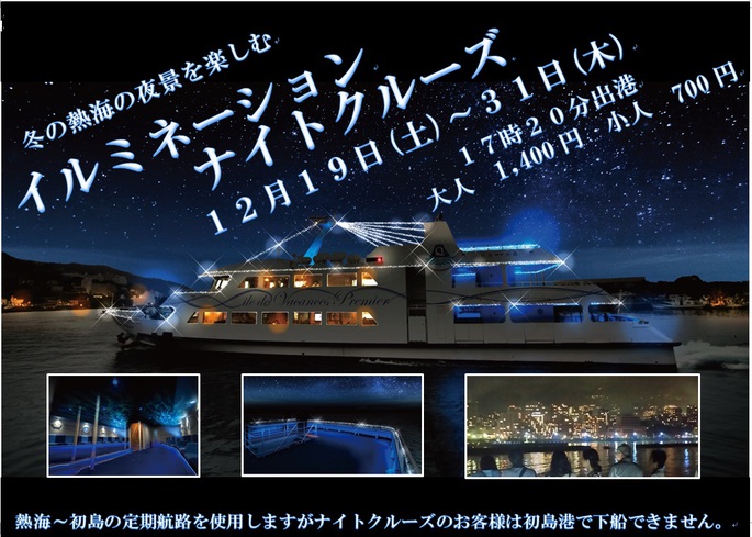 印象的な「熱海の夜景」を、イルミネーションが煌めく「海に浮かぶ特等席」から堪能・・・ ご好評いただいた「ナイトクルーズ」を期間限定で再運航いたします!(2/1~3月中旬予定) 当イベントは「熱海の夜景の美しさ」をもっとたくさんの方々に知って頂きたいという思いから、イルミネーション装飾を施した高速船「イルドバカンスプレミア」へ日没後に特別乗船してもらうものです。 イルミネーションが輝くデッキに立てば、相模湾に沿って広がる熱海市街地の夜景を一望することができます。 さらに、上甲板下ルーム(船の底部)は、天井一面に青い光が波打つようなライティングが施され、まるで「海中クルージング」をしているかのような雰囲気を味わうことが出来ます。 見て良し、乗って良しのイベントです。是非、皆様お誘い合わせの上ご参加下さい! 詳細は以下のとおりです。 イベント名:「熱海~初島イルミネーションナイトクルーズ」 実施期間:平成28年2月1日~3月中旬予定 ※日照時間の都合上、終了日に関しましては急きょ決まることがあります。お早めにご利用下さい! コース :17時20分 熱海港出港 ~ 初島港にて折り返し ~ 18時20分頃 熱海港帰港 ※乗船券は17時より熱海港窓口にて発売します。 (ご予約は不要です) 乗船時間は、トータルで約60分を予定(初島港で下船せずに、そのまま折り返し) 就航船 :「イルドバカンス プレミア」 ※画像イメージ 料 金 :特別価格 大人1400円 小学生700円 (未就学児は無料 ) ※熱海港窓口にて料金をお支払い下さい。17:00頃から発売予定 ※初島で一旦下船する場合は、往復乗船券との差額(大人2400円 小学生1200円)を追加でお支払いいただきますのでご注意下さい。 ※内容は、天候その他理由により、予告無く変更になる場合がございます。予めご了承下さい。 ※この便は、熱海~初島航路の定期便を活用しています。昼間から初島に渡っていた方や通勤・通学で利用している方は、通常の乗船券でご乗船いただくことが出来ます。